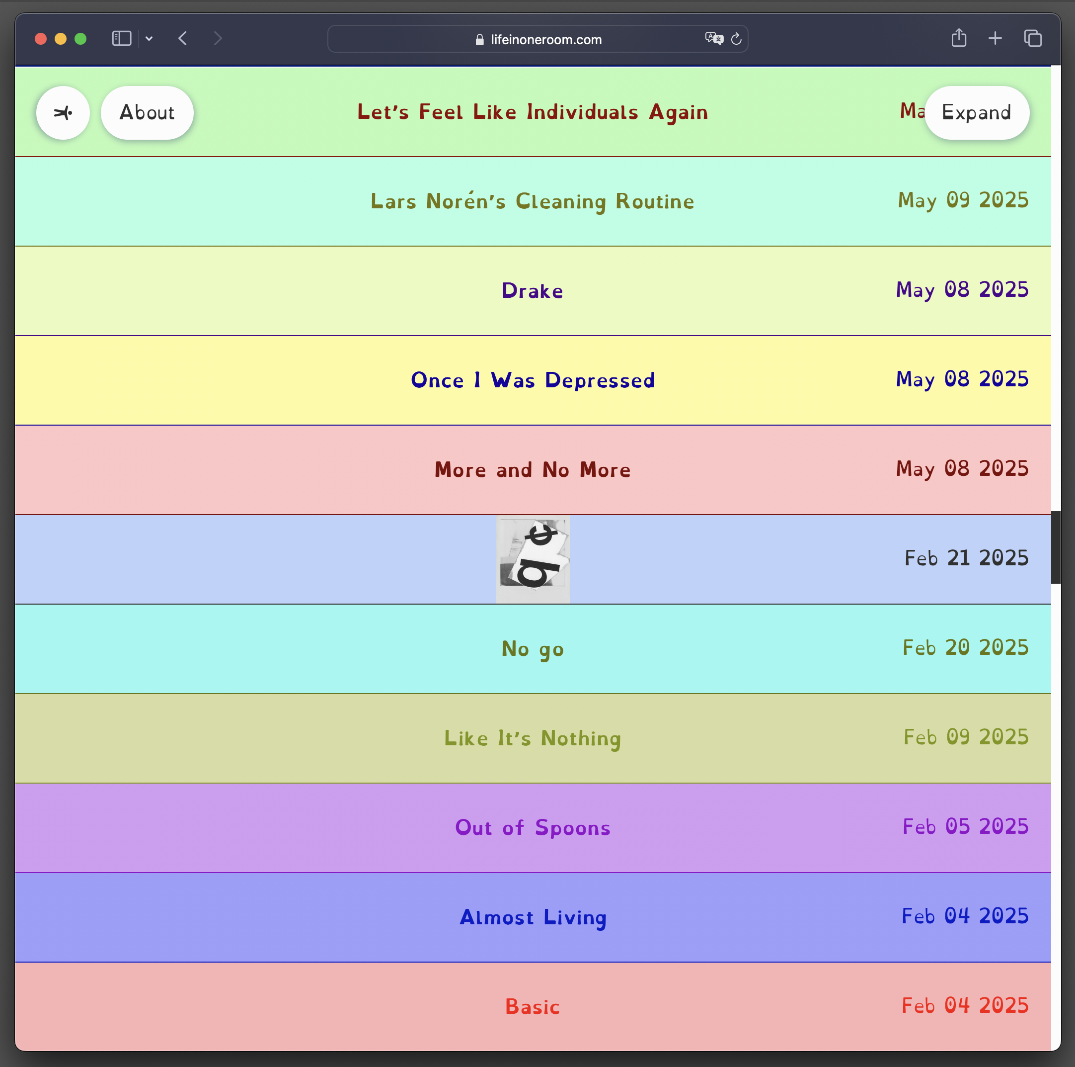 Det blir samtidigt premiär för konstnärens webbplats Lifeinoneroom.com - en digital plattform där Diktgymnasiet löpande publicerar aspekter av sitt arbete, bit för bit efter förmåga och dagsform. Titeln refererar till lägenheten som konstnären, på grund av sin sjukdom, bara i undantagsfall lämnar. Lifeinoneroom.com har också formgivits av Konst & Teknik, utifrån tanken om digital tillgänglighetsanpassning som en konstnärlig strategi.
